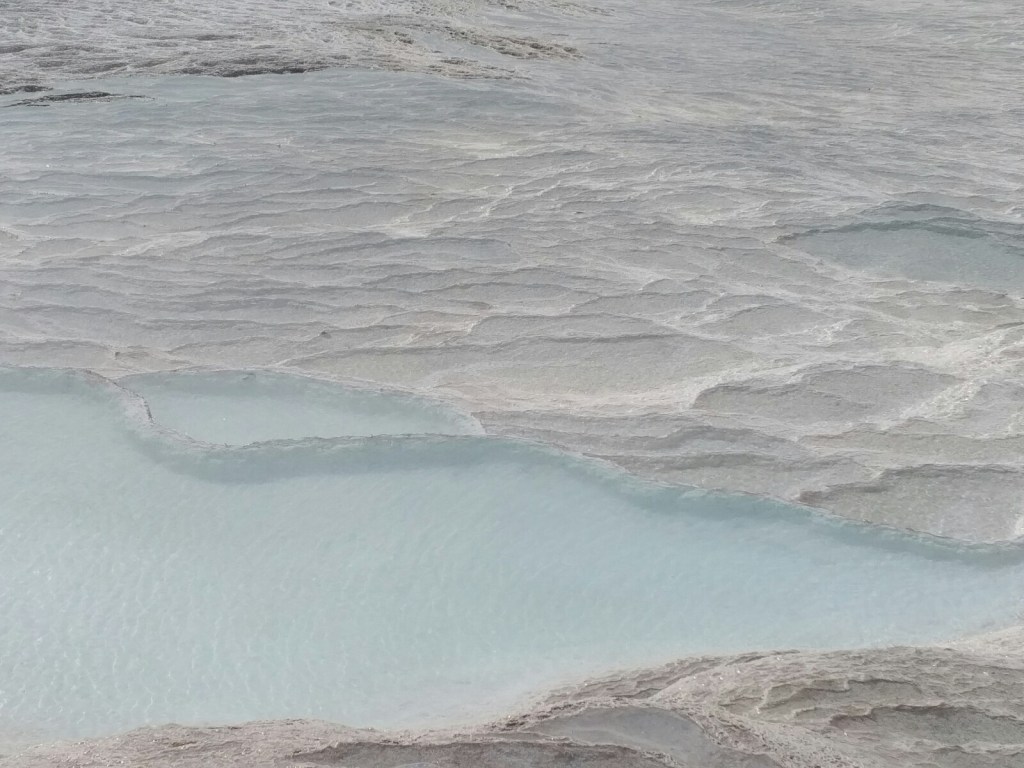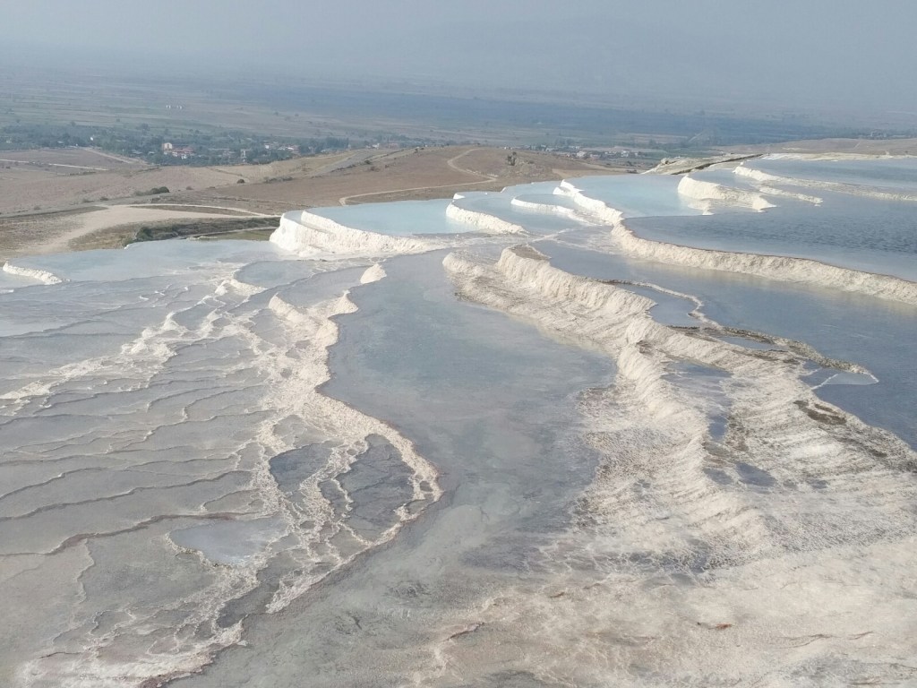 Turkey has frequent earthquakes because the Anatolian plate on which it sits is squeezed between the mighty African and Eurasian plates that are moving in opposite directions. Pamukkale is not situated on a plate boundary, but near a meeting point of four Graben, areas of multiple faulting and rifting caused by these plate movements. At Pamukkale, the crust has thinned as a result of the tortuous stretching of the Anatolian plate so much that it has fractured, resulting in a network of faults and fissures. Hot water from the mantle percolates through the crust, bringing with it the minerals dissolved from the local limestones, and deposits these on the surface in the form of the milky white travertine that visitors come from far and wide to see. In addition, a cocktail of noxious gases are discharged as the hot mineral rich fluids reach the surface and today, close by to the translucent blue pools in which these visitors dip, taps are visible that vent discharging gases such as carbon dioxide and sulphur dioxide, make the place safe to visit.